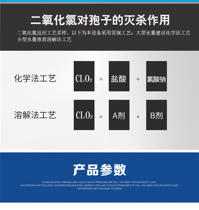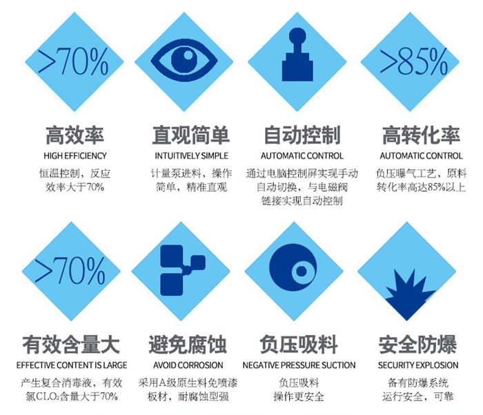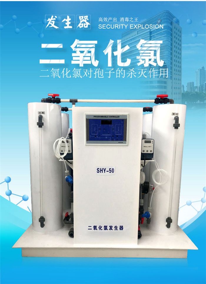 二氧化氯發(fā)生器是一個安全可靠的自動閉環(huán)系統(tǒng),化學(xué)藥劑的反應(yīng)過程完全是在封閉的反應(yīng)器中進行,而加藥過程又是在封閉的混合器中完成,從而使系統(tǒng)避免了泄漏的可能。