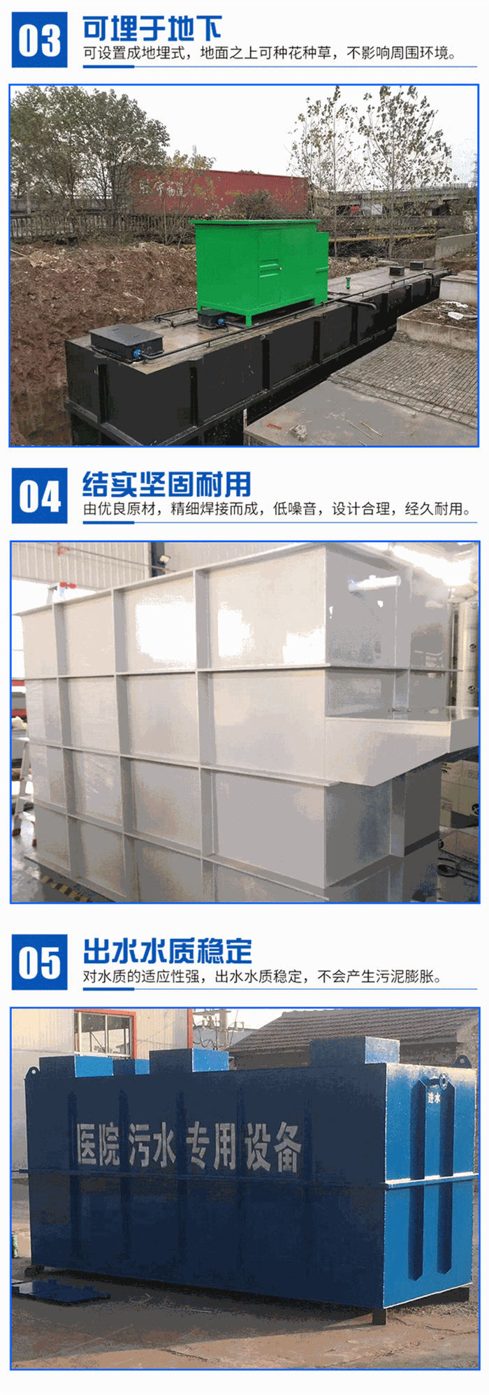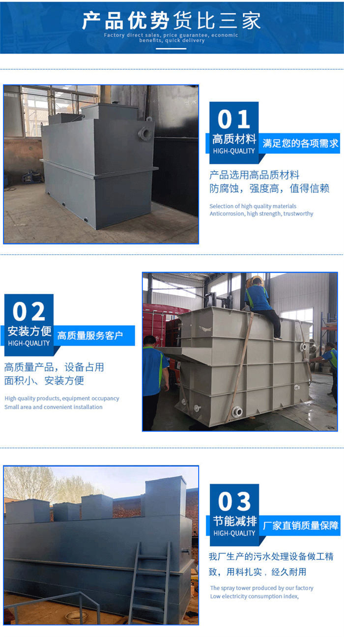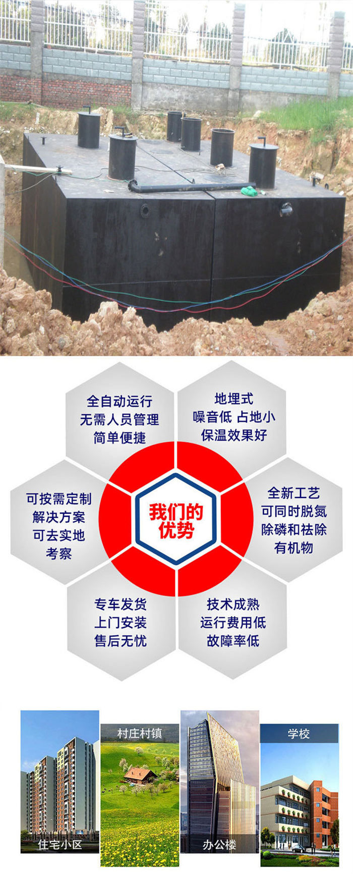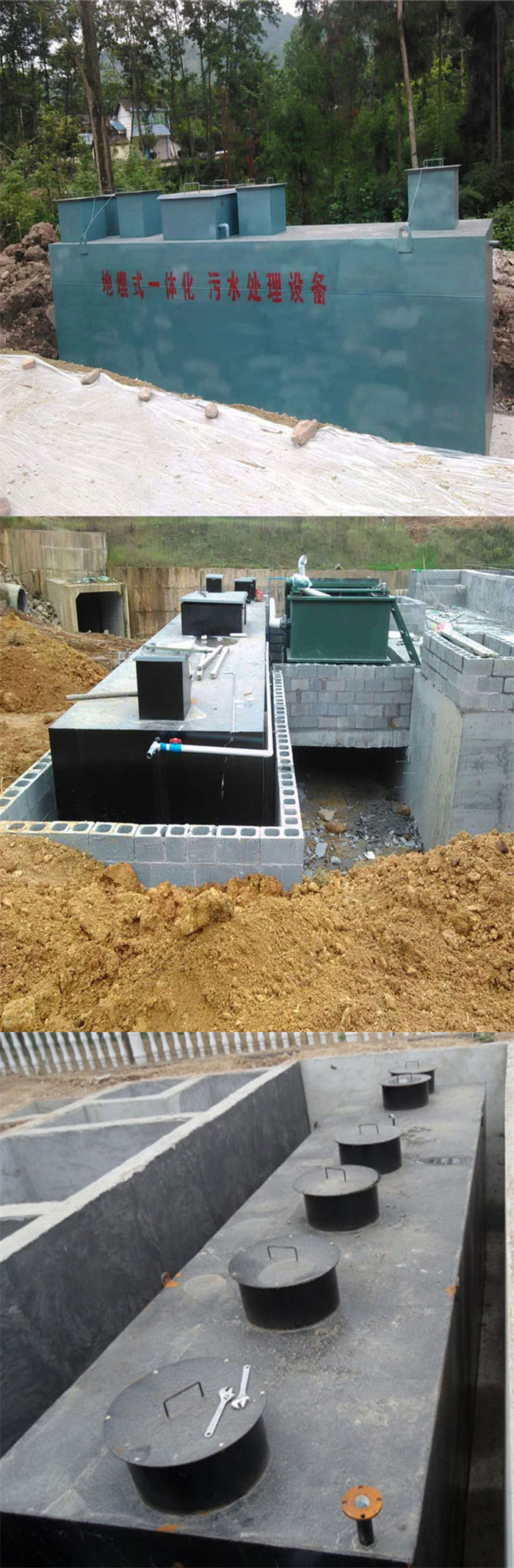 根據目前國內同類生活污水處理技術的現狀,在綜合考察各種廢水治理技術的基礎上,結合本項目的實際,擬采用“化糞池+格柵+調節池+缺氧池+生物接觸氧化+MBR+二氧化氯消毒”工藝進行污水處理,MBR幾乎不需要排泥,通過回流即可維持長久性運行。具體流程為:污水收集匯入化糞池,出水經格柵去除其中較大的雜質和漂浮物,再經調節池調節水量水質后進入缺氧池,去除大分子有機物,同時提高污水可生化性。在缺氧池進行反硝化,通過硝化液的回流,去除污水中的總氮,并提高氨氮的去除率。缺氧池出水進入接觸氧化池,內設填料,增加污水與好氧微生物的接觸面積,使污水中的有機物等大幅降低。經好氧處理后的污水自流進入MBR池,mbr膜池內置污泥,通過曝氣維持污泥活性,進一步去除有機物,并過濾澄清水質。MBR膜池的水通過自吸泵提升至消毒池,經二氧化氯發生器消毒后進入清水池,清水池儲存的清水達標排放。